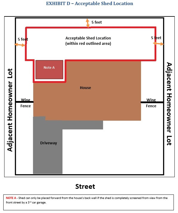 • 2.85.4. Location Criteria: Storage Sheds and Accessory Buildings must be located in the fenced, rear yard area and must be located behind the home per Exhibit D. For Lots where split rail fence lines exist, Storage Sheds and Accessory Buildings must be located on the opposite side of the Lot away from the split rail fence and such Storage Sheds and Accessory Buildings must be screened so as not to be viewed in full from the split rail fence side of the Lot.